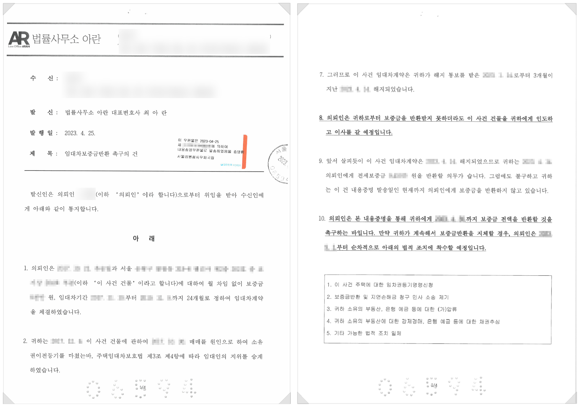 최아란 변호사가 발송한 보증금 반환 촉구 내용증명의 일부