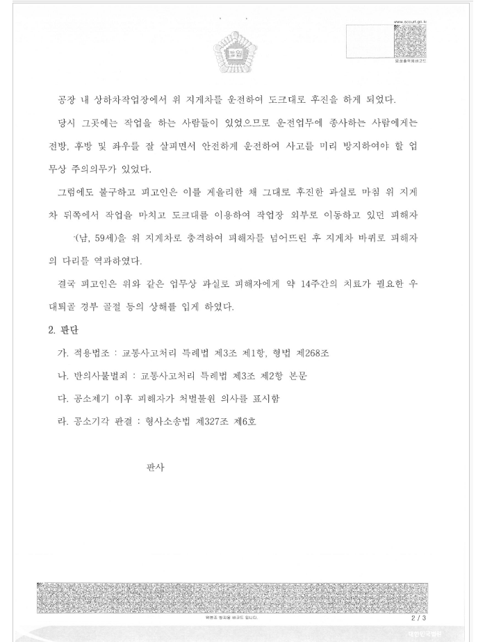 의뢰인은 지게차를 운전하다가 운행 과실로 동료 직원인 피해자를 역과하여 전치 14주의 중상을 입혔습니다.