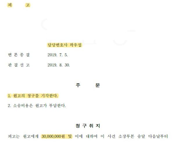 그럼에도 불구하고 재판부는 저의 의견에 손을 들어 주어 상대방의 청구를 모두 기각하고, 소송비용까지 상대방이 전무 부담하는 판결을 내렸습니다.
