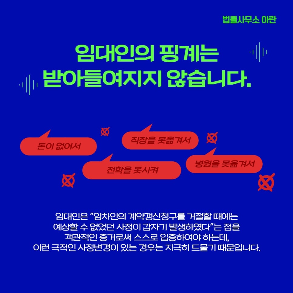 하필 그 시기에 딱 맞추어 극적인 변화가 있는 경우는 지극히 드뭅니다. 결국 소송을 수행해보면 임대인들이 핑계는 모두 말뿐이거나, 계약갱신을 거절할 당시에 이미 충분히 예상할 수 있었던 사정에 불과하기 때문에 임대인들의 주장은 받아들여지지 않고 있습니다.