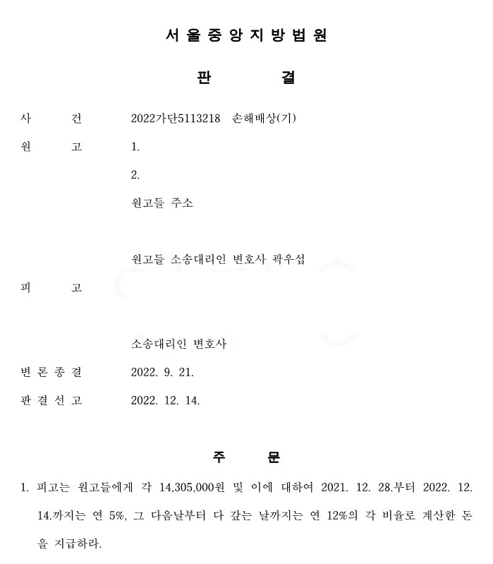 법원에서도 선례가 없었던지라 법정 싸움이 상당히 지속되었습니다. 긴 공방 끝에 저는 임대인이 실거주하겠다는 허위 사유로 임차인의 계약갱신청구를 거절한 경우 임차인에게 손해를 배상하여야 한다는 선례를 이끌어 내어, 의뢰인은 약 3,000만 원의 손해배상을 보상 받을 수 있었습니다.