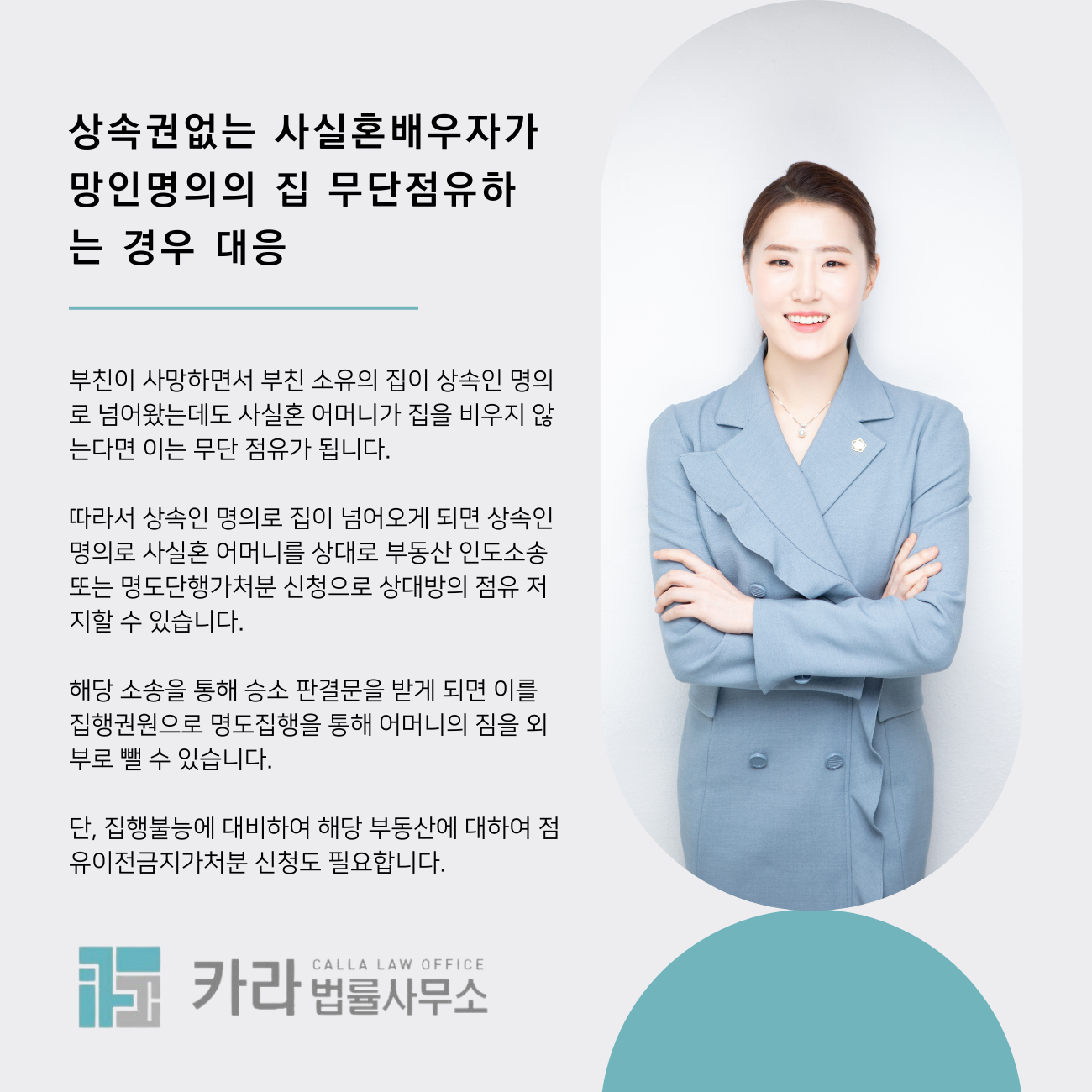 따라서 상속인 명의로 집이 넘어오게 되면 상속인 명의로 사실혼 어머니를 상대로 부동산 인도소송 또는 명도단행가처분 신청으로 상대방의 점유 저지할 수 있습니다.