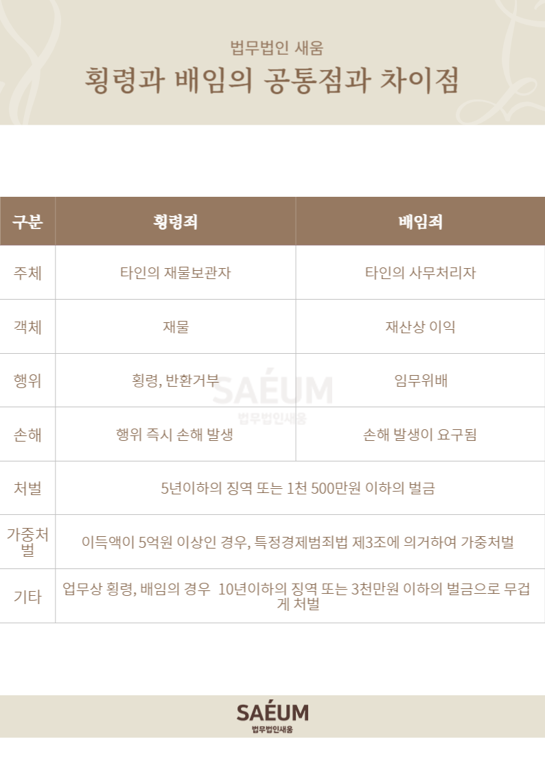 다시 말해, 횡령과 배임의 공통점과 차이점을 비교하면 다음과 같습니다.