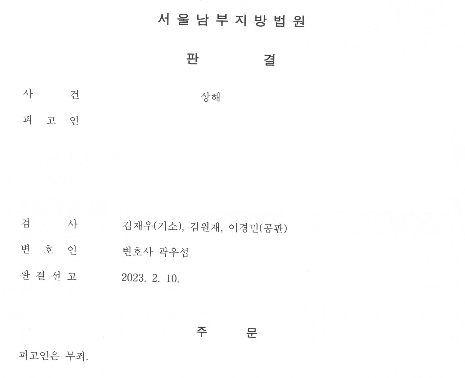 그러나 저는 이 사건이 일어나게 된 상황을 처음부터 끝까지 분석하고, 재판부에 의뢰인이 피해자를 상해입히지 않았다는 점을 납득시키려고 노력하였습니다. 또한 의뢰인의 진술 태도가 분명하고 진실됨을 강조하고, 이 사건 공소사실에 따르면 상해부위가 골절될 수 없다는 점을 의학적으로도 설명하였습니다.