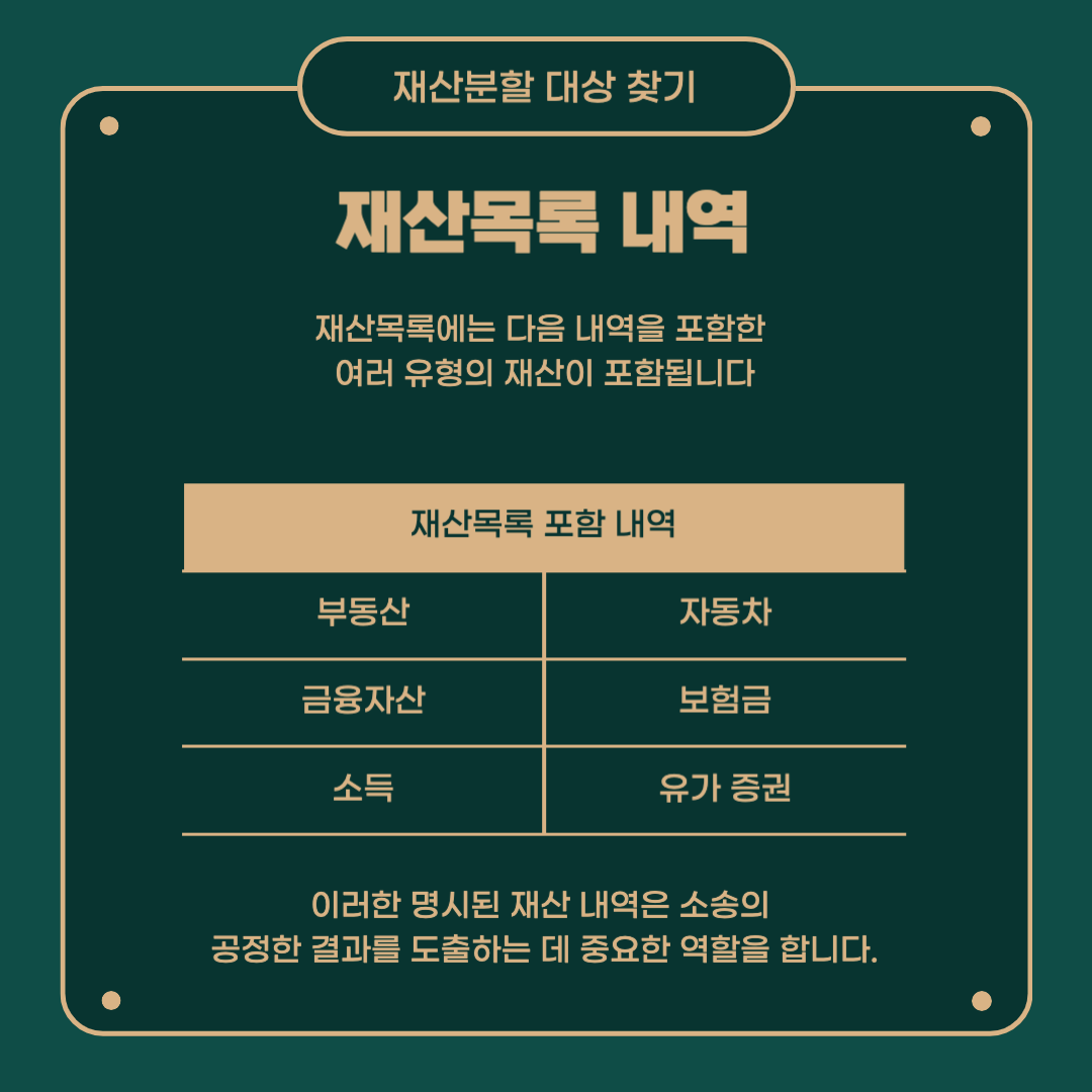 재산목록에는 부동산, 자동차, 금융자산, 권리, 그리고 다른 유가증권, 보험금, 소득 등을 포함한 여러 유형의 재산이 포함됩니다. 이러한 명시된 재산 정보는 소송의 공정한 결과를 도출하는 데 중요한 역할을 합니다.