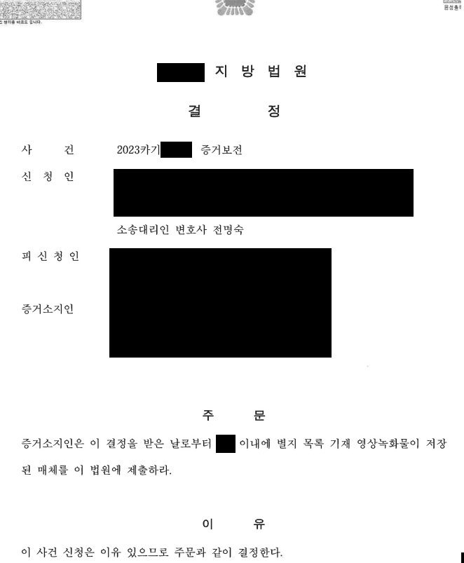 의뢰를 받은 당일 증거보전신청서를 접수하였고 신청서를 꼼꼼히 작성한 결과 접수일로부터 이틀만에 증거보전결정이 나왔습니다. 드디어 이 결정문을 토대로 cctv 영상을 받아 볼 수 있게 된 것입니다.