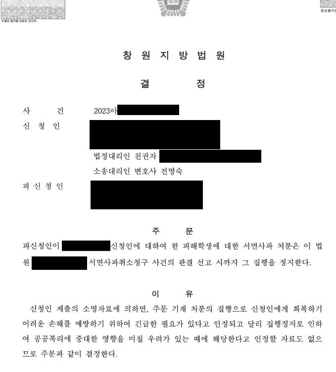학교에서 아이가 감내해야 할 상황이 너무나 고통스럽거나 이 사건과 같이 억울한점이 있는 경우, 혹은 학폭처분으로 인해 회복할 수 없는 손해를 입을 위험에 처했다면 처분 직후 집행정지신청을 하는게 좋습니다.
