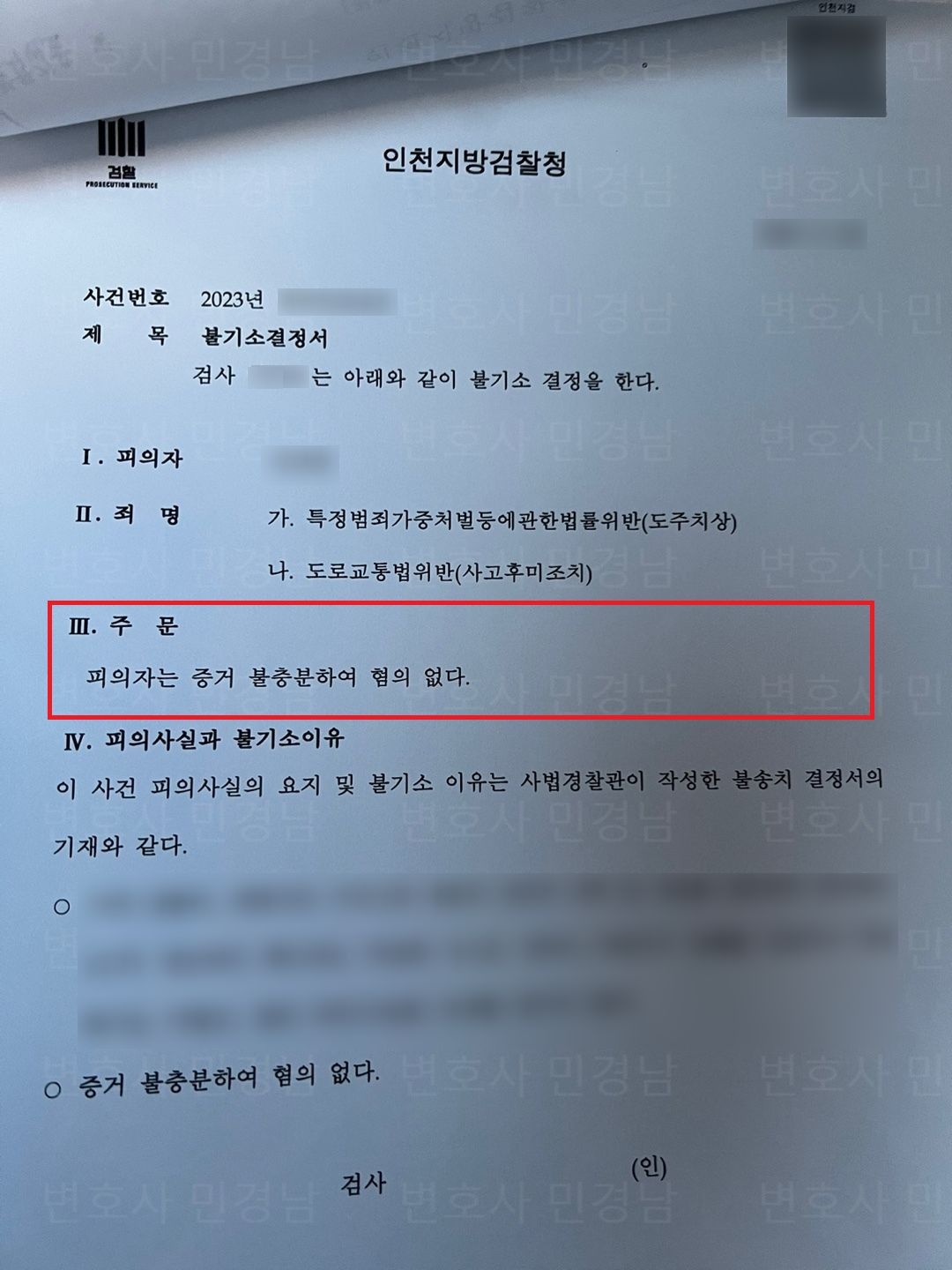 검찰에서 최종적으로 특정범죄가중처벌등에관한법률위반(도주치상), 도로교통법위반(사고후미조치)에 대하여 증거 불충분으로 혐의 없다는 결정을 하였습니다. 덕분에 의뢰인분께서는 5개월만에 면허를 회복하실 수 있었습니다. 만약에 재판까지 갔다면 최대 2년 이상까지도 갈 수 있는 사안이었는데 수사 단계에서 최대한 적극적으로 대응한 덕에 신속하게 수사를 종결시키고 일상생활로 돌아가실 수 있어서 저 또한 보람이 있었던 사건이었습니다.
