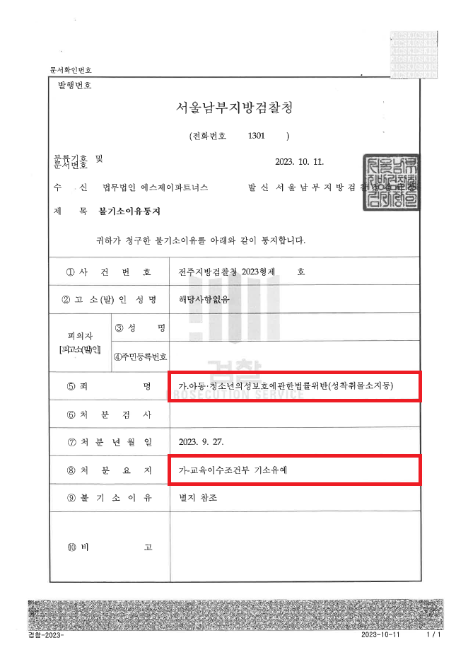 이러한 저의 조력을 바탕으로 A씨는 소지 부분만 인정되어 죄명이 아청법위반(성착취물제작·배포등)등에서 아청법위반(성착취물소지등)으로 변경되고 이에 대해서도 기소유예 처분을 받음으로써 억울한 누명에서 벗어날 수 있었을 뿐만 아니라 성범죄 전과자가 될 위기에서도 벗어날 수 있었습니다.