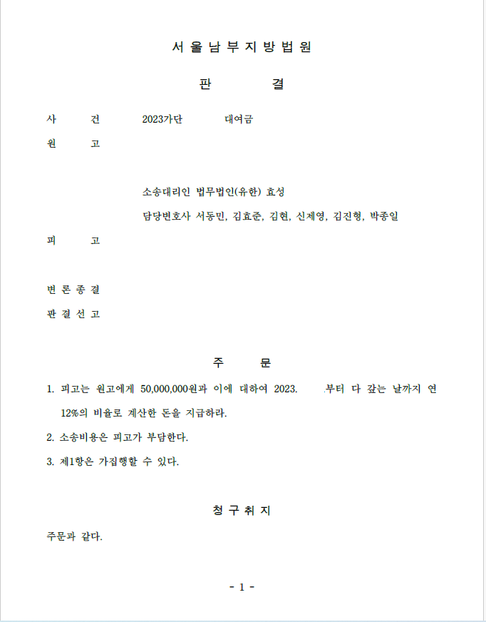 저는 즉각 대여금청구소송을 제기하여 대여사실을 기타 증거로 주장 입증하였고 법원은 원고 승소 판결을 선고하여 의뢰인은 대여금을 변제받았습니다.