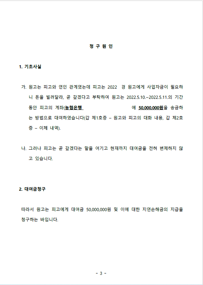 의뢰인은 연인 관계였던 피고에게 사업자금 명목으로 돈을 빌려주었으나 피고는 이를 변제하지 않고 헤어지면서 잠적하여 급하게 저를 찾아오셨습니다.