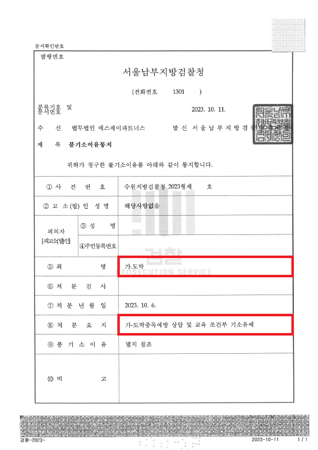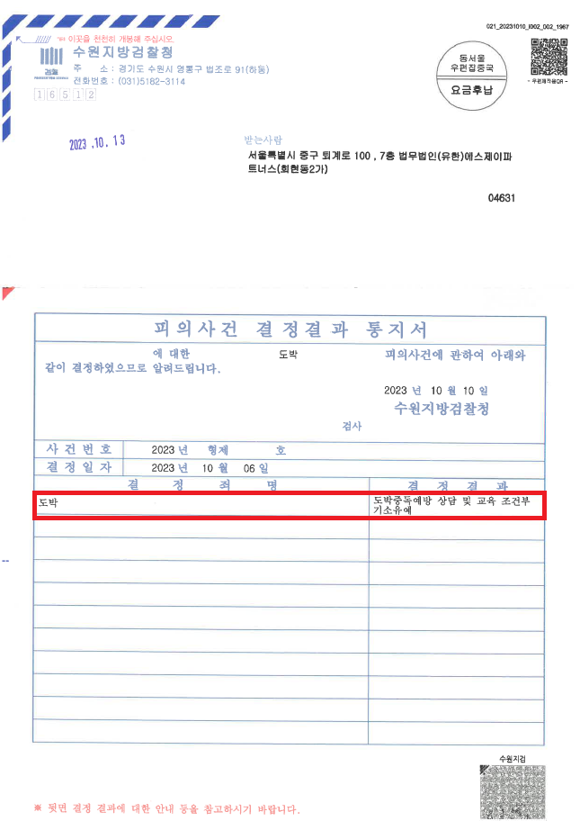 이러한 저의 조력을 바탕으로 A씨는 국민체육진흥법위반(도박등)죄가 아닌 형법상 도박죄가 적용되고 이에 대해 기소유예 처분을 받음으로써 전과자가 될 위기에서 벗어날 수 있었습니다.