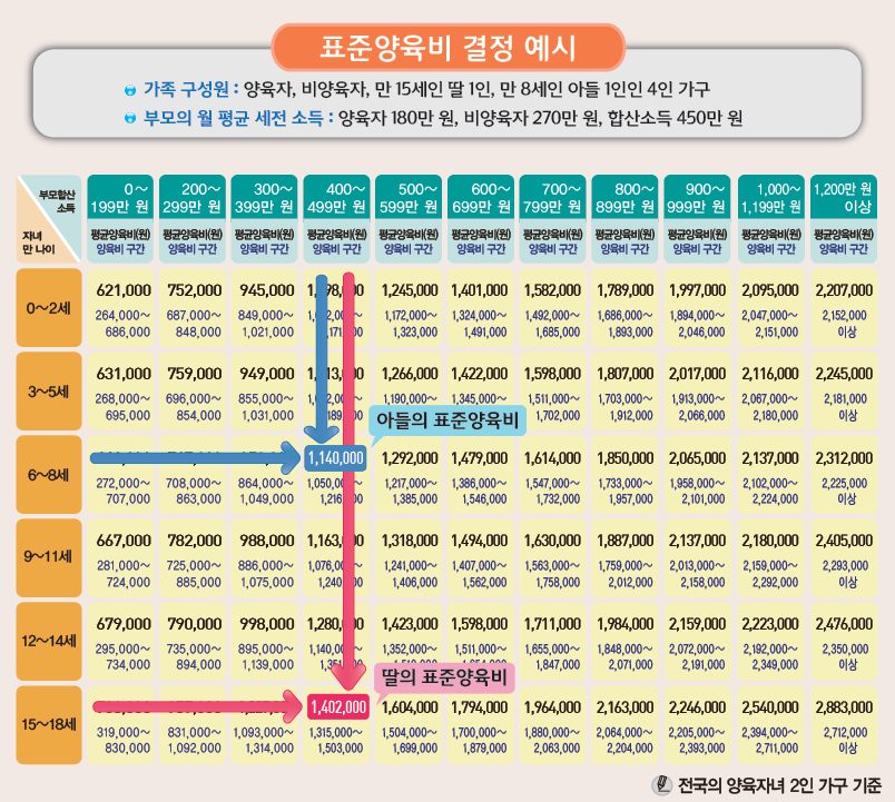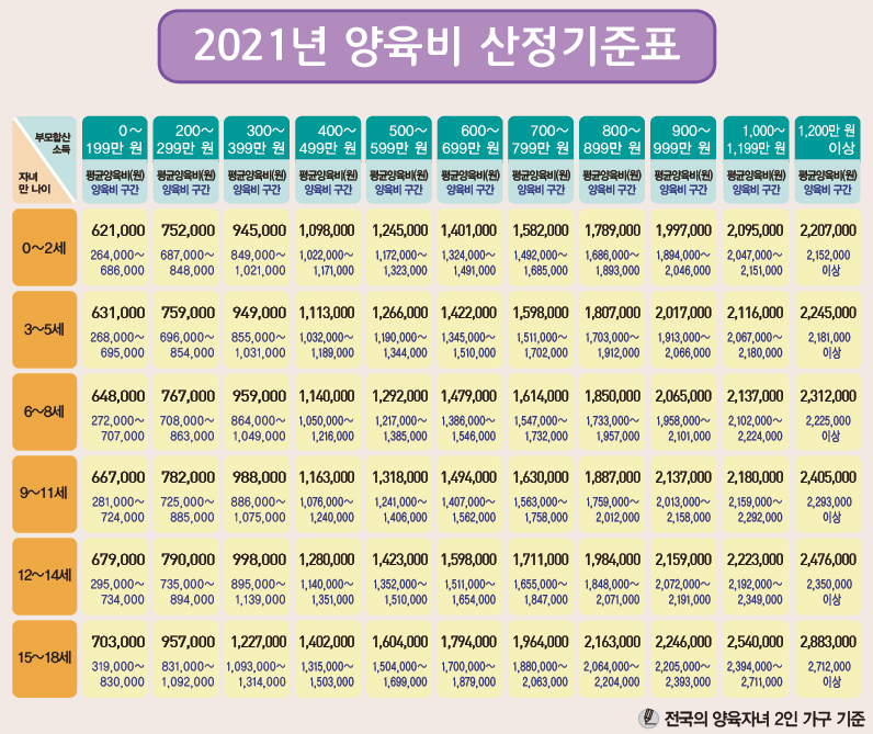 서울 가정법원은 위와 같이 양육비 산정기준표를 2021. 12. 22. 공표 2022. 3. 1.부터 시행하고 있습니다. 해당 양육비 산정 기준표는 참고자료이지만 전국의 가정법원의 재판실무에서 양육비 산정의 중요한 기준으로 정착되어 활용되고 있습니다.