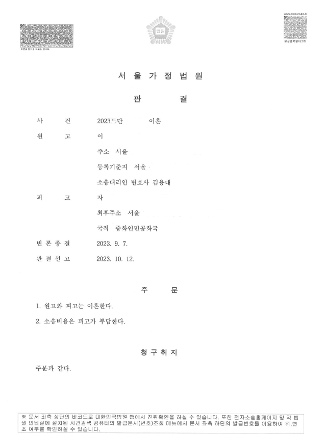 이에 서울가정법원은 B씨가 출국한 때로부터 약 1년이 경과한 시점인 2023년 9월경 재판기일을 지정하였고, 본 법률사무소는 B씨도 이혼의 의사가 있다는 간접 증거들을 법원에 제출하였으며, 이에 서울가정법원은 2023년 10월경 원고와 피고는 이혼한다라는 판결을 내렸습니다.