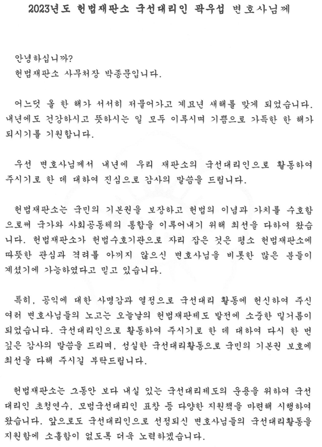 헌법재판소는 올해 전국의 변호사 중 80명을 국선대리인으로 선정하였습니다. 헌법재판소 대리인은 헌법 분야에 다양한 경험 및 관심을 가진 변호사 중에 선정되는 것으로서 그 중 한 명으로 저 역시 선정되었습니다.