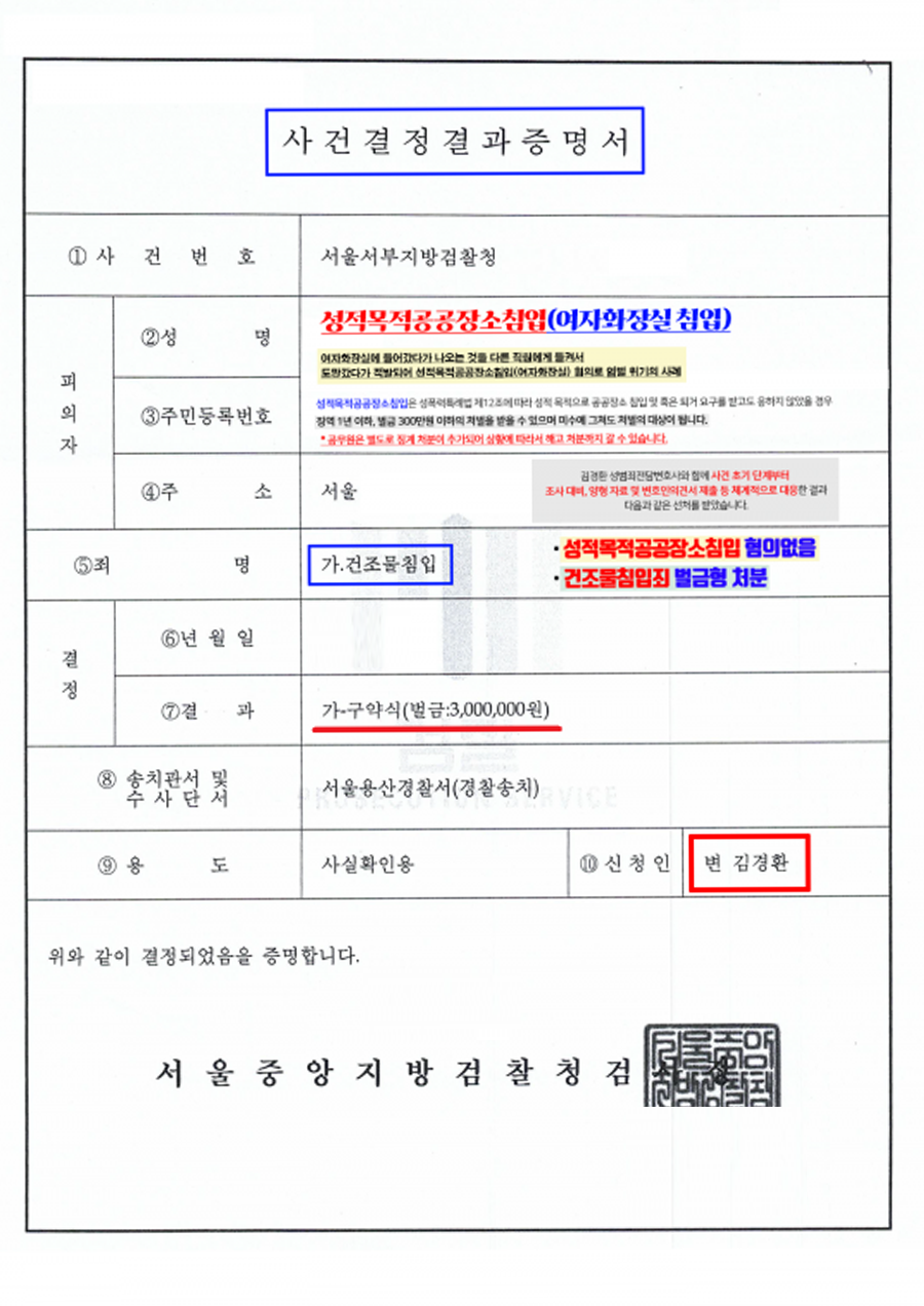 회사 내에서 이 사건에 대해 엄정 조치를 하겠다는 공문이 떨어졌고, 며칠 뒤 의뢰인은 성적목적공공장소침입(여자화장실 침입)에 대한 경찰조사를 받아야 했습니다.