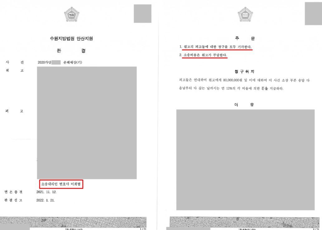 원고의 소송제기 1년 만에 원고의 청구가 모두 기각되면서 전부 승소하여 피고였던 의뢰인에게 좋은 결과를 이루어낼 수 있었습니다.