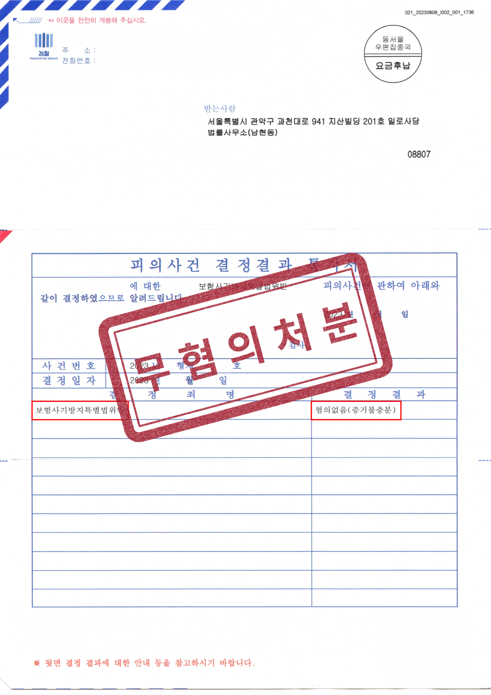 일로 변호사의 성공적인 변론에 따라 해당 사건은 무혐의 처분을 받을 수 있었습니다.