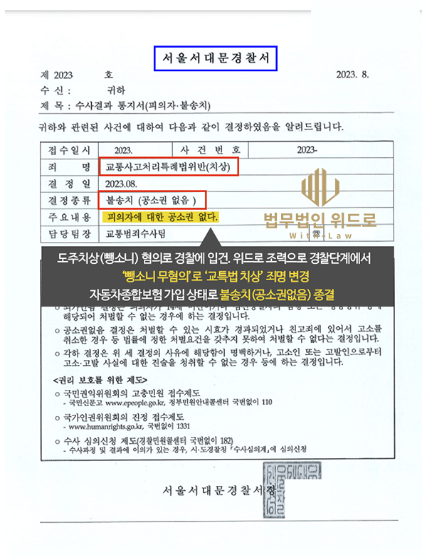 뺑소니로 신고 된 의뢰인. 경찰조사 단계부터 위드로가 조력하여 도주치상 무혐의로 교통사고처리특례법위반(치상)죄로 사건명이 변경되었고, 의뢰인이 자동차종합보험 가입 상태로 공소권 없어지면서 전체 혐의에 대하여 불송치로 종결