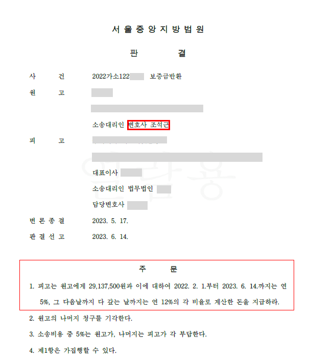 의뢰인은 미납 공과금을 제외한 보증금 전액을 받을 수 있었습니다. 현재 상대가 항소하여 2심 계류중입니다. 항소심에서도 저희 위솔브는 최선을 다해 상대의 부당한 주장과 공격을 막아낼 것입니다. 반드시 그렇게 합니다. 2심 결과 나오면 알려드리겠습니다. 감사합니다.