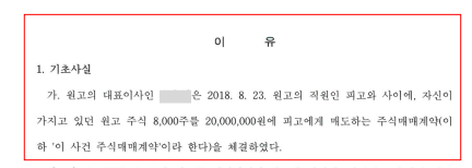 재판부는 의뢰인의 100% 승소를 인정합니다. 저희가 제출한 증권거래세 납부내역과 주식매매 계약서에 현금 부분이 스모킹 건의 역할을 합니다. 확고한 열정으로 시작했다가 사업이 파기됐지만, 의뢰인은 자신이 기여한 대가에 대해서 확실한 보상을 받았습니다. 피고는 1심에서 패소해서 항소까지 했지만, 항소심도 의뢰인의 100% 승소입니다.
