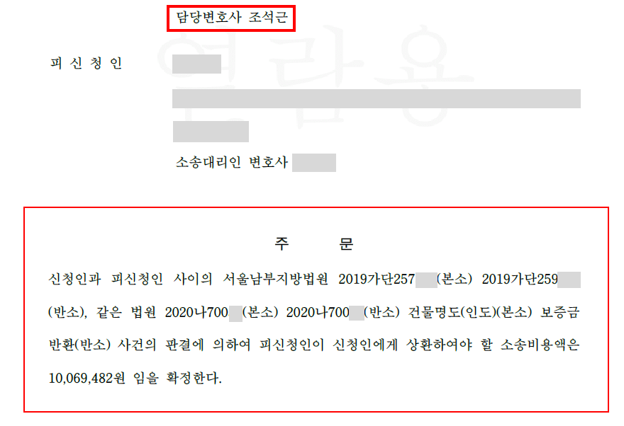 본 소송은 이미 2번이나 승소했는데, 저희는 의뢰인이 소송비용까지 받을 수 있게 도와드렸습니다. 본소 반소 병합시 소송비용 계산이 복잡합니다. 자칫 소송비용을 받을 수 있다는 것 자체를 모르는 분도 많습니다. 그래서 저희는 원금 뿐만 아니라 그 동안 지출된 소송비용도 청구 가능한 점을 먼저 안내하고, 소송비용 확정을 받아서 추심하는 것까지 처리했습니다.