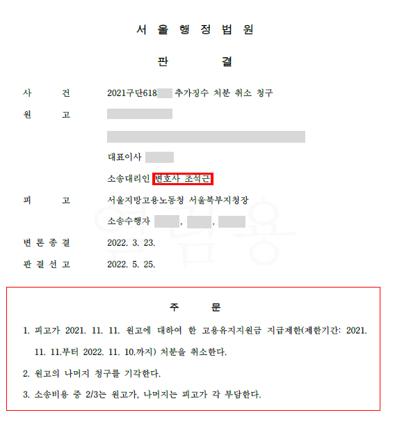 재판부는 행정청의 처분을 취소하라는 판결을 내립니다. 대개 행정청의 처분이 법원에 의해 취소되는 경우는 많지 않습니다. 소송 도중 법원이 행정청에 지시해서 처분을 다시하라고 하기 때문입니다. 하지만 이 사건은 법원에 의해 처분 자체가 취소되었다는데 의미가 있습니다. 이로써 의뢰인은 최초의 기간 도과 후 추가 지원금을 신청할 수 있게 되었습니다.
