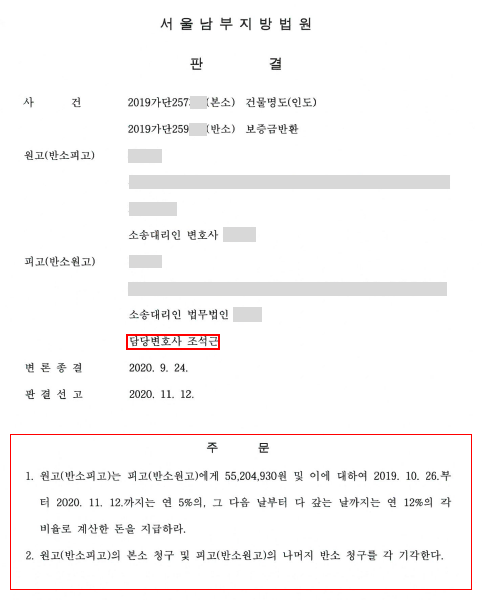 의뢰인의 보증금 반환은 승소하고, 상대방의 명도 청구는 방어했습니다. 의뢰인은 보증금 원금, 지연손해금, 손해배상금을 모두 받을 수 있었습니다. 1심, 2심 소송비용까지 모두 회수했습니다. 소송은 오래걸렸지만 그 만큼 손해금을 충분히 받을 수 있어서 상처뿐인 영광은 아니었습니다. 앞으로도 저희 위솔브는 의뢰인의 이익을 위해 최선을 다할 것입니다.