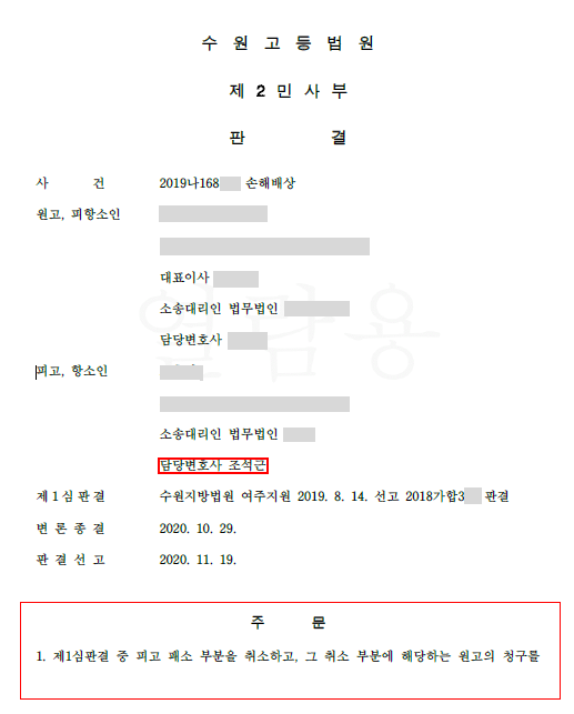 의뢰인은 2심에서 100% 승소합니다. 10억원을 0원으로 만든 것입니다. 1심 재판부에서 2억이지만 잘못된 판단을 지적하고 항소심에서 상계항변을 추가해서 0원으로 만들 수 있었습니다.