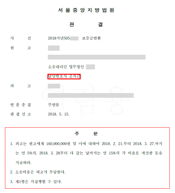 상대방이 결국 무대응, 불출석하여 1회 기일에 무변론 승소판결을 얻었습니다. 원금 1억 6천만원, 지연손해금 연12% 소송비용까지 모두 인정받습니다. 이를 바탕으로 의뢰인은 바로 집행에 나설 수 있었고, 경매가 진행되는 것을 본 상대방은 즉시 연락해서 돈을 정산해주었습니다.
