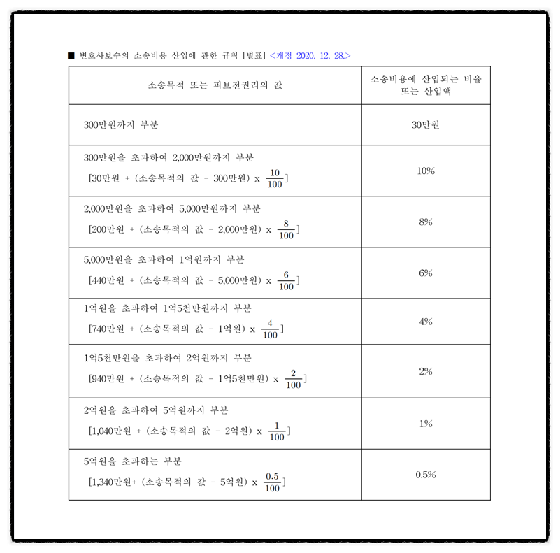 소송비용은 인지대, 송달료, 변호사보수 등으로 이루어져 있습니다. 일반적으로 소송비용 중 변호사보수가 적지 않은 비중을 차지하는데, 일정한 범위 내에서 패소자가 부담하게됩니다. 소송비용에 산입되는 변호사보수의 범위는 「변호사보수의 소송비용 산입에 관한 규칙 [별표]」에 따라 정해집니다. 예를들어 소가가 5,000만원인 사건을 전부승소하는 경우, 상대방에게 변호사보수 440만원을 청구할 수 있고, 소가가 2억원인 사건을 전부승소하는 경우, 상대방에게 변호사보수 1,040만원을 청구할 수 있습니다.