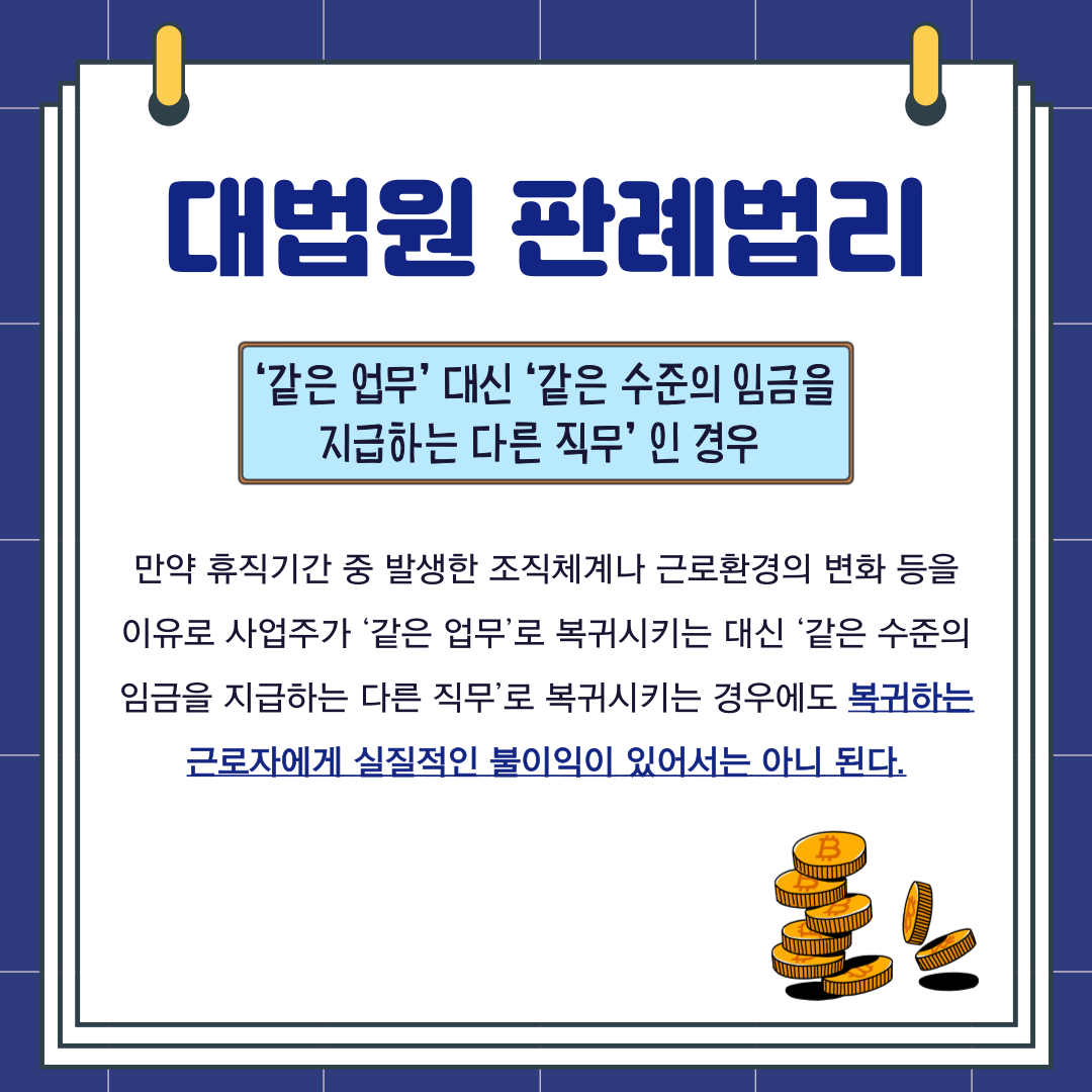 만약 휴직기간 중 발생한 조직체계나 근로환경의 변화 등을 이유로 사업주가 '같은 업무'로 복귀시키는 대신 '같은 수준의 임금을 지급하는 다른 직무'로 복귀시키는 경우에도 복귀하는 근로자에게 실질적인 불이익이 있어서는 안됩니다.