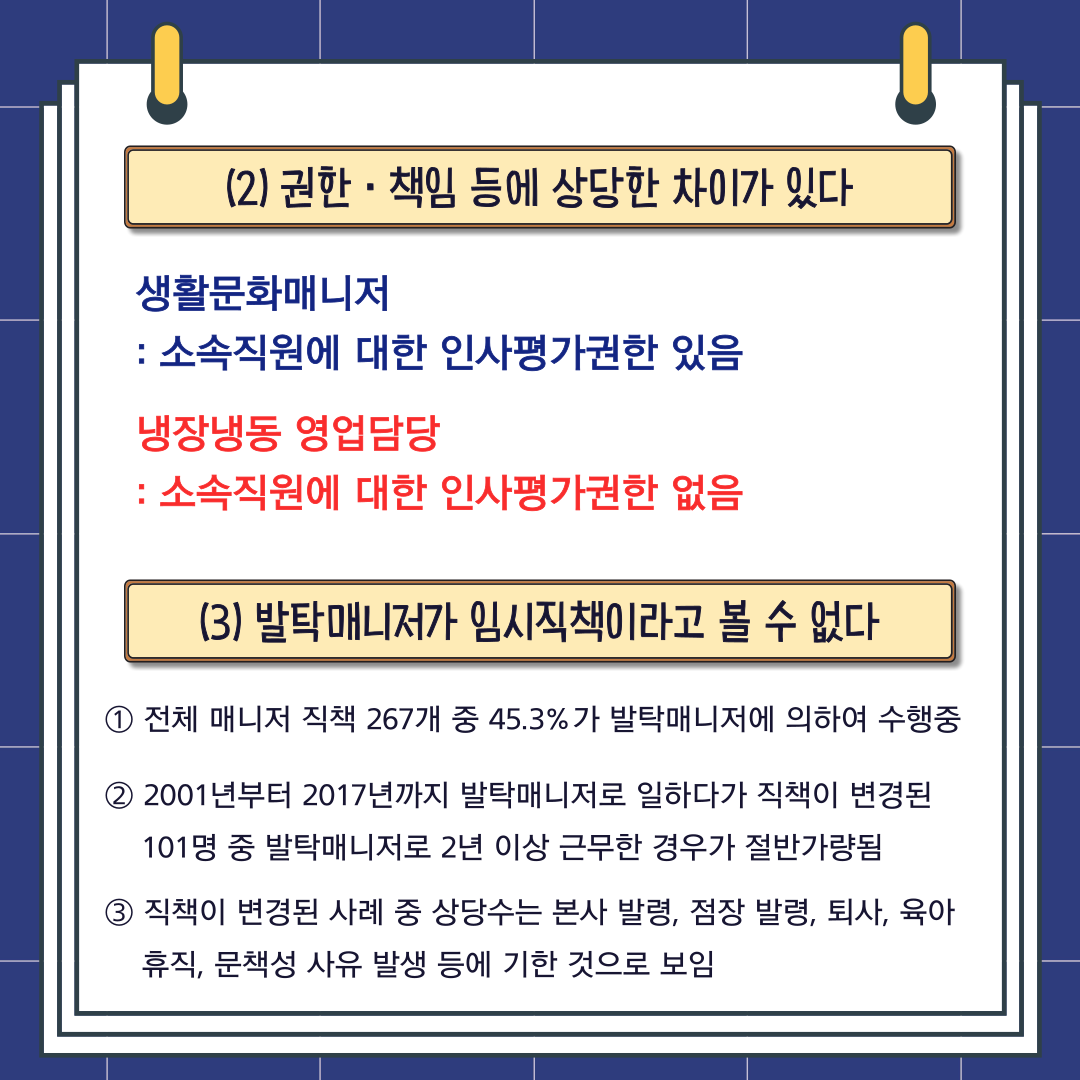 ② 2001년부터 2017년까지 발탁매니저로 일하다가 직책이 변경된 101명 중 발탁매니저로 2년 이상 근무한 경우가 절반가량 되며, 도중에 직책이 변경되었다가 다시 발탁매니저로 일한 기간까지 포함하면 발탁매니저로 일한 기간이 평균 39개월 정도나 되는 점, ③ 위와 같이 직책이 변경된 사례 중 상당수는 본사 발령, 점장 발령, 퇴사, 육아휴직, 문책성 사유 발생 등에 기한 것으로 보이는 점 등
