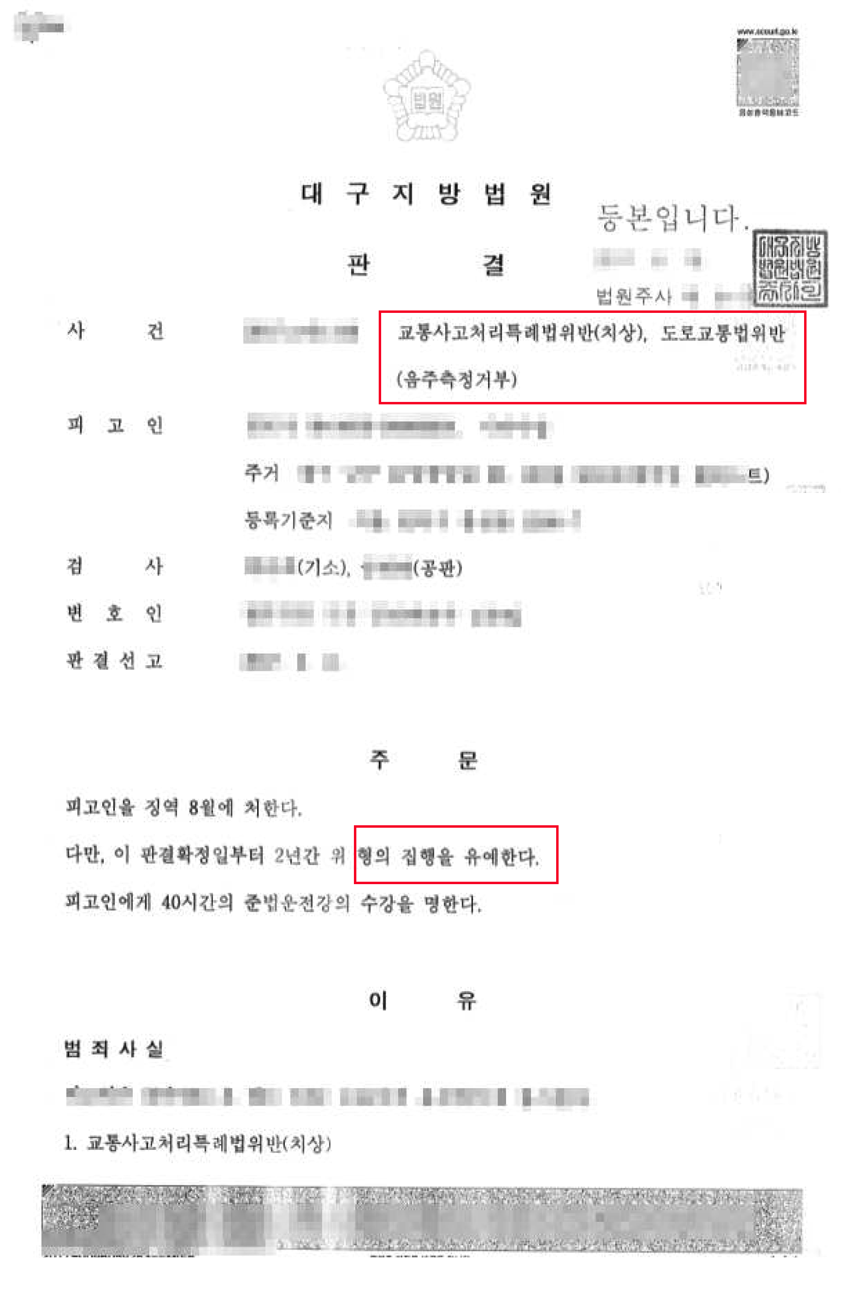 음주측정거부 및 치상으로 실형위기였으나, 양형사유 정상참작되어 집행유예 선고