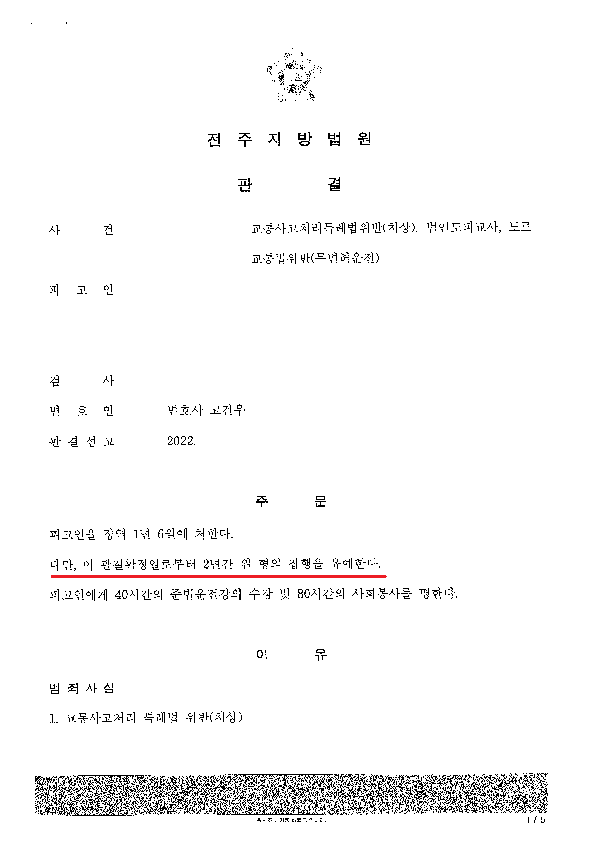 위와 같은 노력을 기울인 결과 징역형의 집행유예와 준법운전강의 및 사회봉사명령이 선고되었습니다.