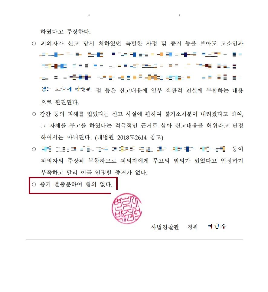 이러한 점들도 모두 종합한 구체적 의견을 담은 변호인의견서도 추가 제출되었고 경찰은 의뢰인 님이 허위사실을 거짓으로 고소한 것이 아니라고 판단하여 불송치 (혐의없음) 결정을 하게 되었습니다.