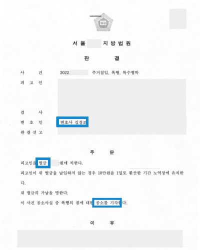 ①주거침입과 특수협박은 벌금형으로 방어하였고