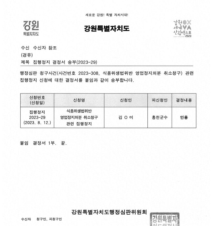 그래서 본 변호인은 신속하게 행정심판 제기 후 같은 날 영업정지처분에 대한 집행정지신청도 하였고, 별도로 해당 행정심판위원회에 유선연락을 통해 집행정지신청에 대한 신속한 결정을 부탁드렸습니다. 그래서 2일만에 영업정지처분에 대한 집행정지결정을 받을 수 있었습니다.