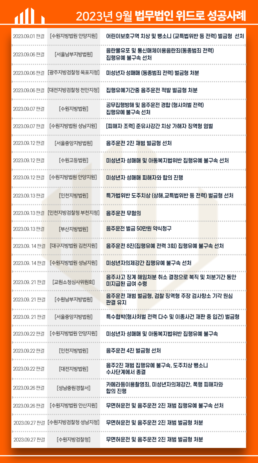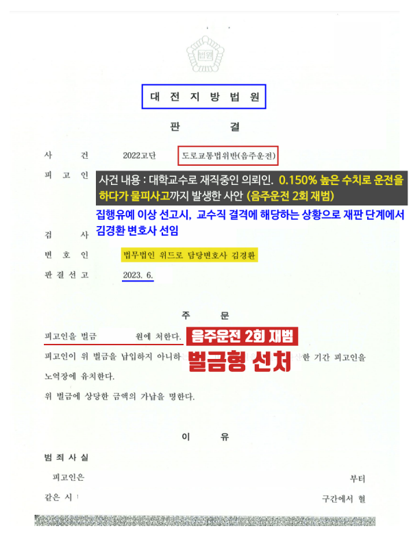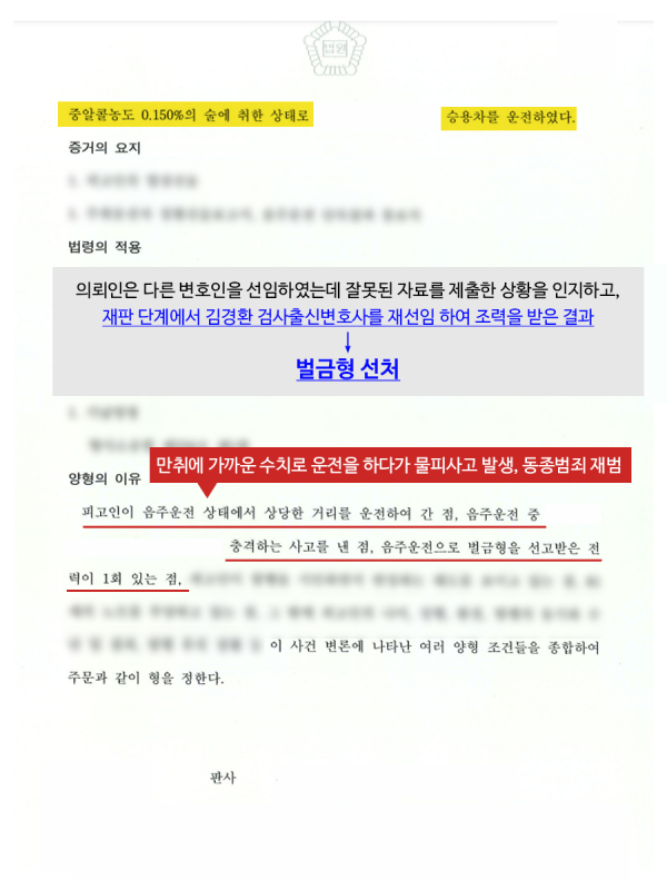 그 결과, 재판부는 음주2회 적발, 주취상태에서 물피사고 유발 등 불리한 요건들이 많지만 김경환 변호사의 변론을 참작하여 선처한다며 벌금형 판결로 재판을 종결하였습니다.