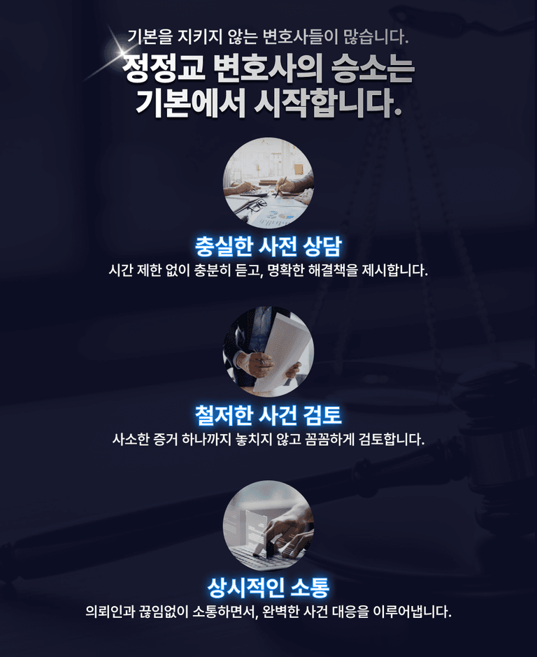 형사사건이 발생하여 수사를 받게 되는 경우 많은 분들께서 법률사무소 여암의 정정교 변호사와 상담을 받은 뒤 정정교 변호사를 선임해주시고 있으며, 정정교 변호사는 의뢰인들의 믿음에 보답하여 수많은 무혐의 처분과 무죄 판결을 이끌어내고 있습니다.