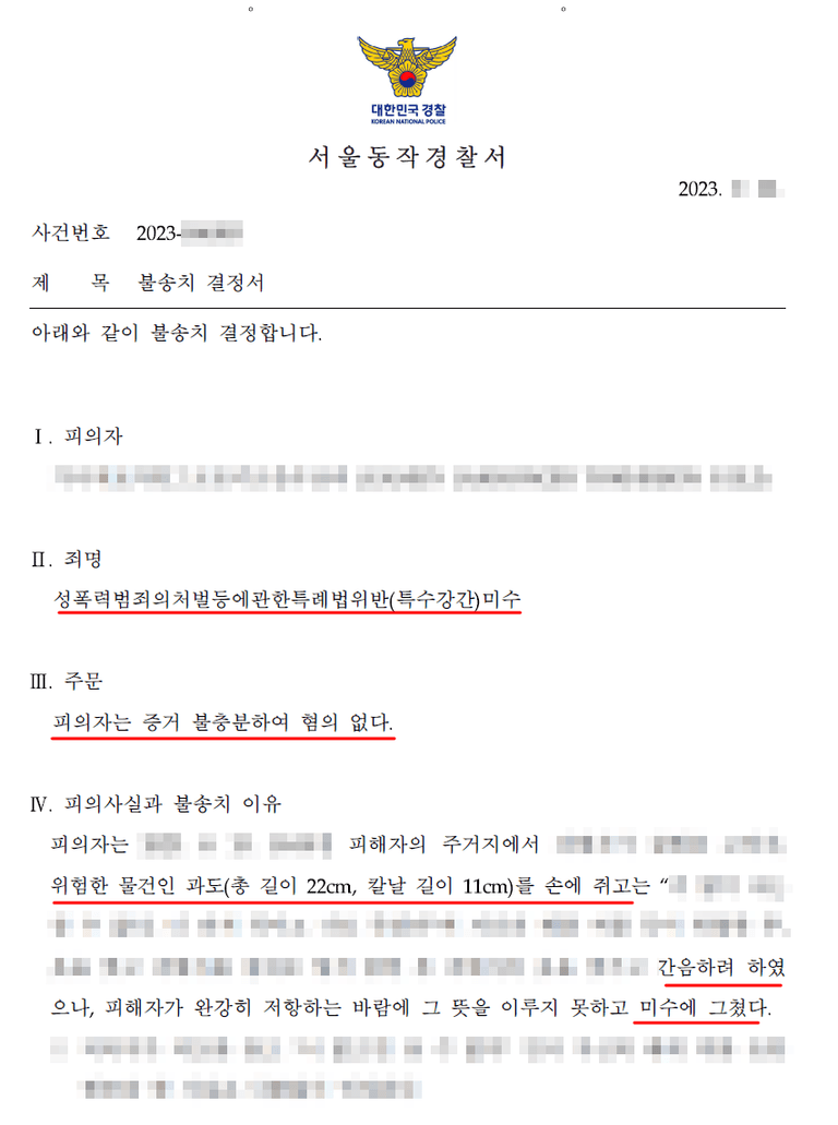 아래 사례는 송파 변호사 법무법인 여암의 정정교 변호사가 특수강간미수 혐의로 수사를 받던 의뢰인을 변호하여 무혐의 불송치 결정을 이끌어낸 사안입니다.