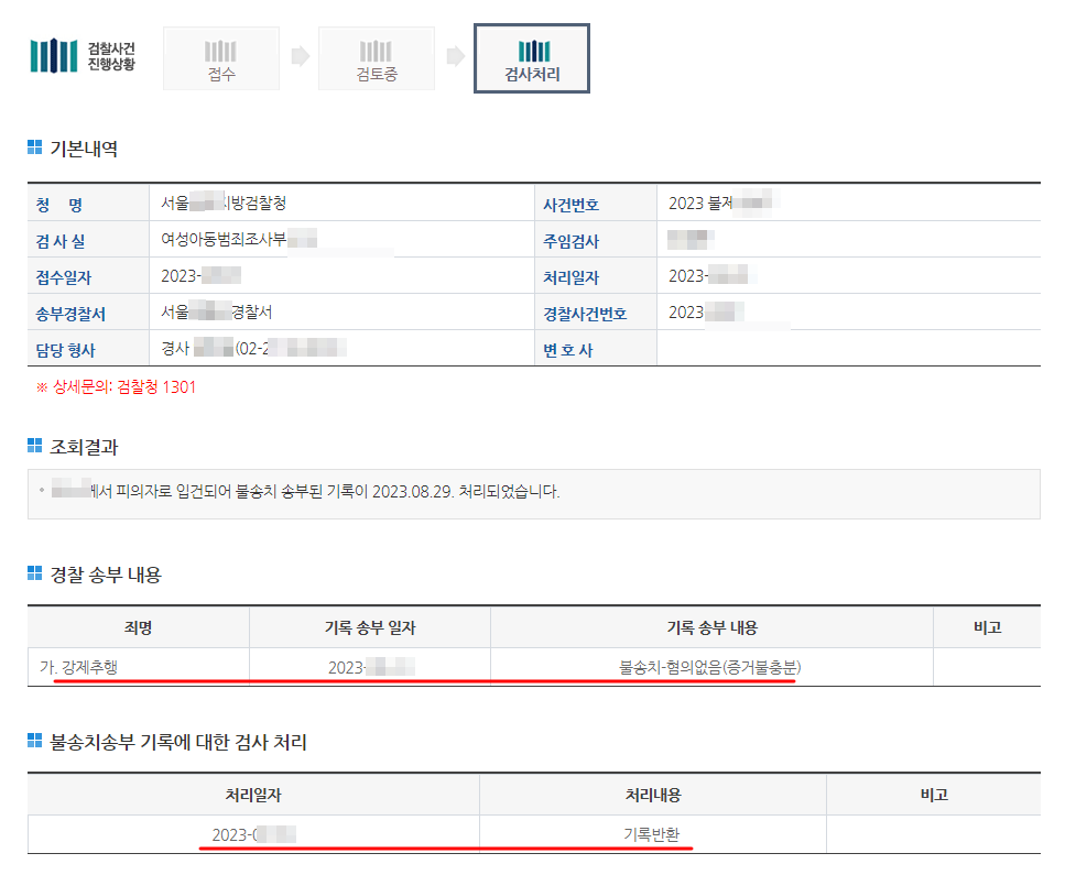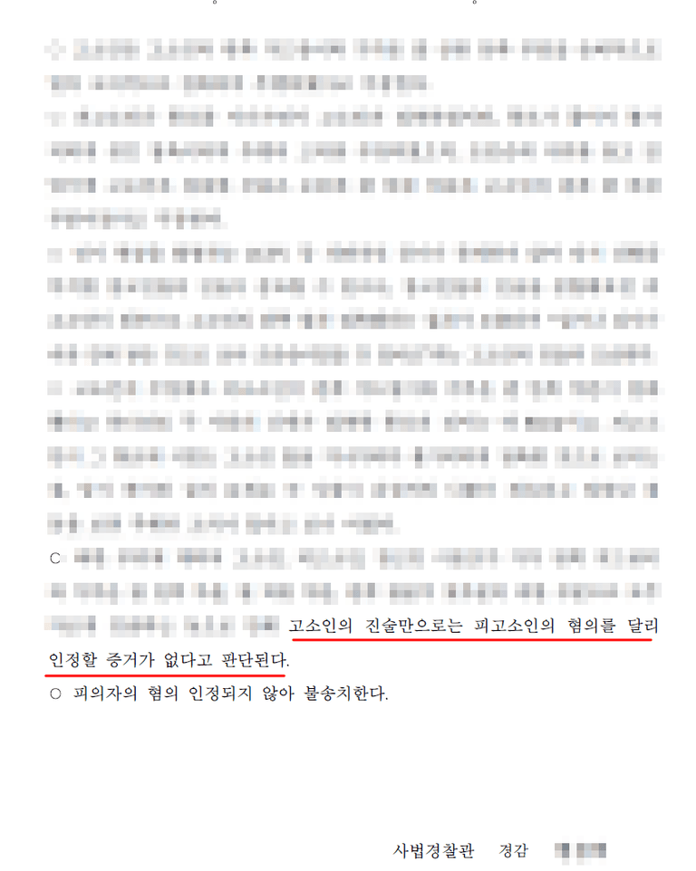 담당 검사 역시 피의자에게 혐의가 없다고 판단하여 '기록반환'으로 사건은 종결되었습니다.