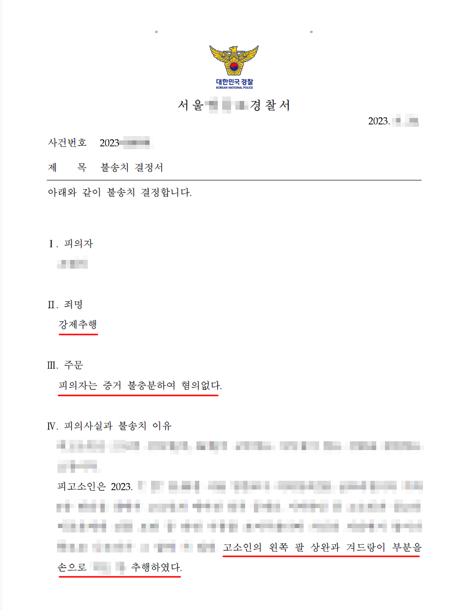 결국 경찰은 정정교 변호사의 의견을 받아들여, '무혐의 불송치'로 사건을 검찰에 올렸습니다.