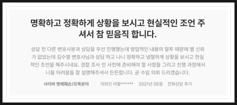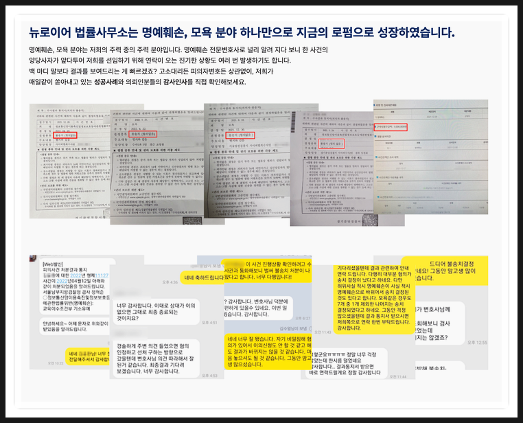 저희는 명예훼손 사건을 특화하며 형사 전문 변호사님을 필두로 1:1 책임 변호를 도와드리고 있는데요.