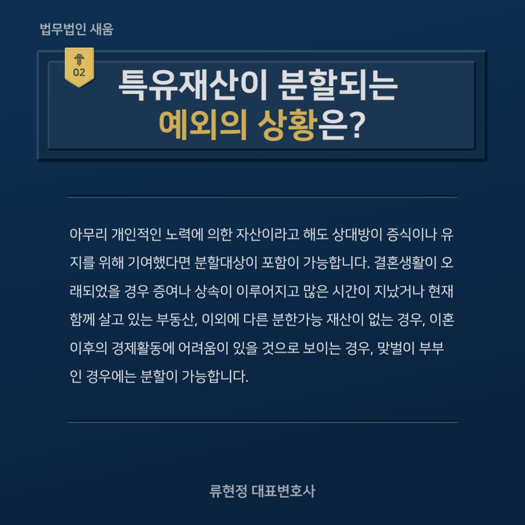 이혼을 하게 되었을 때 중요하게 다루어지는 것들 중에 하나가 바로 재산분할이라고 할 수 있습니다. 어떻게 분할을 하는 가에 따라서 이혼 후의 삶이 결정된다고 해도 과언이 아닐 정도이기 때문에 이 부분에 대해서 중요하게 생각하는 분들이 상당히 많은 것을 볼 수 있습니다. 보통 결혼 후 같이 모은 재산에 대해서 각자의 기여에 맞게 나눠 가지게 되는데, 모든 재산을 다 포함하지는 않으며 유산이거나 결혼 전의 재산 등은 포함되지 않는 것이 원칙이기는 합니다. 다만 혼인 기간 전에 생성된 재산이라고 하여도 분할의 대상이 될 수도 있어 주의가 필요한데요. 오늘은 특유재산이란 무엇이며 어떻게 분할이 가능한지에 대해서 알아보도록 하겠습니다.