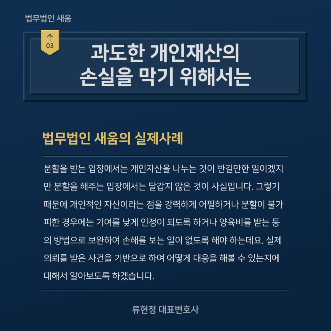 분할을 받는 입장에서는 개인자산을 나누는 것이 반길만한 일이겠지만 분할을 해주는 입장에서는 달갑지 않은 것이 사실입니다. 그렇기 때문에 개인적인 자산이라는 점을 강력하게 어필하거나 분할이 불가피한 경우에는 기여를 낮게 인정이 되도록 하거나 양육비를 받는 등의 방법으로 보완하여 손해를 보는 일이 없도록 해야 하는데요. 실제 의뢰를 받은 사건을 기반으로 하여 어떻게 대응을 해볼 수 있는지에 대해서 알아보도록 하겠습니다.