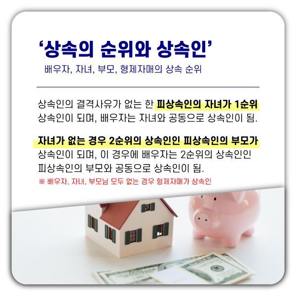 우리나라에서는 『법정상속인』이라는 개념으로 부모, 배우자, 자녀, 형제자매 등을 포함하여 아래의 표와 같이 상속의 순위를 정하고 있습니다.