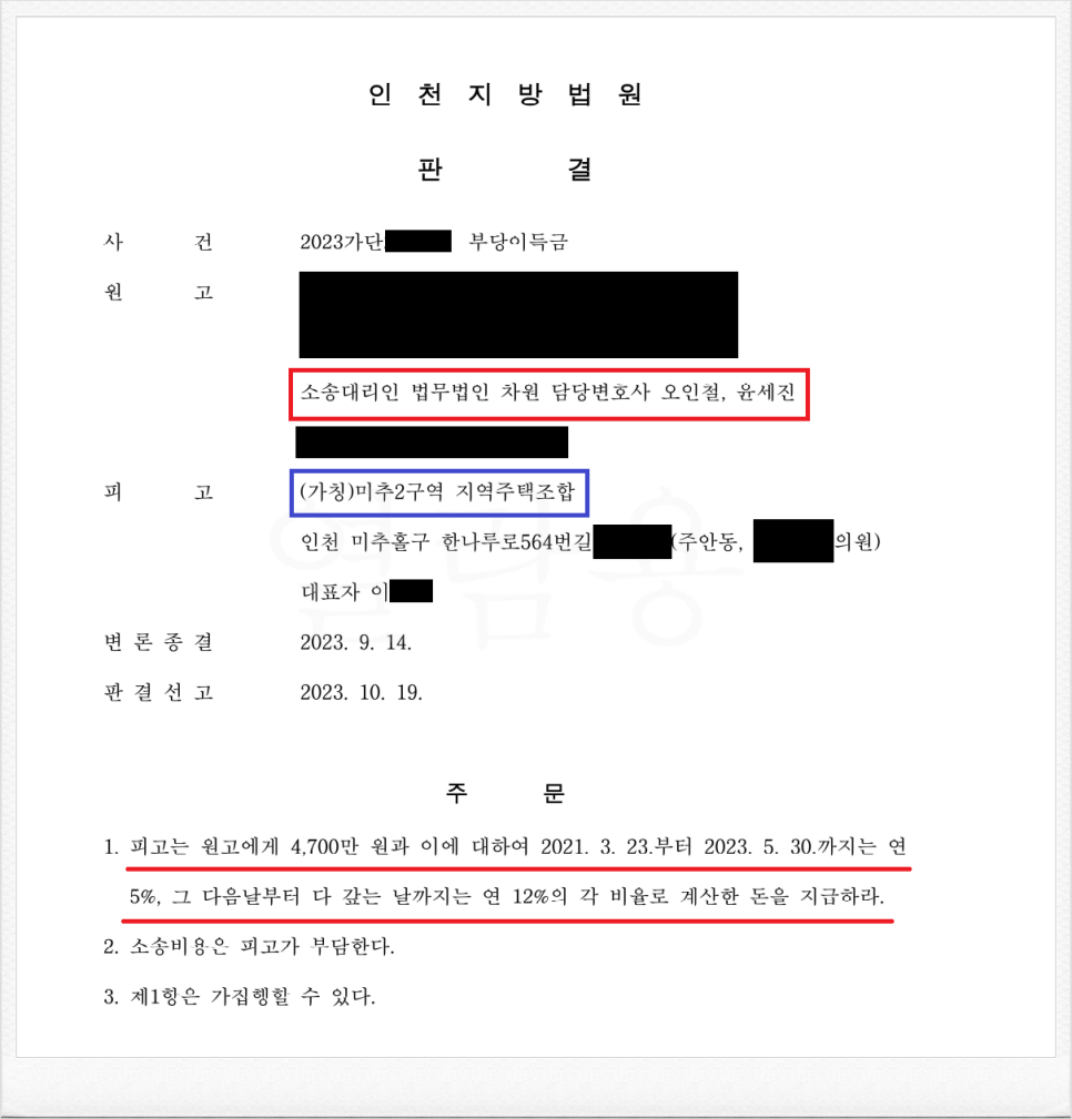 결국, 재판부는 이러한 저의 주장을 받아들였고, 피고는 의뢰인에게 기지급 받은 금원 및 이에 대한 지연손해금을 지급하라는 내용의 판결을 이끌어 내었습니다.