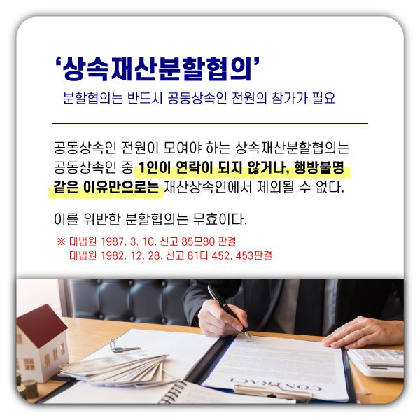 이러한 상속재산분할을 위해서 상속재산분할협의를 우선 진행하게 되는데, 이때 반드시 공동상속인 전원이 참여하여 협의하여야 합니다.