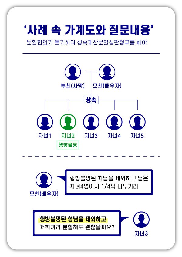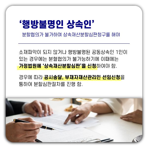 오늘은 이처럼 연락이 되지 않거나, 오래전 행방불명된 가족이 있는 경우에 상속재산을 분할하는 방법에 대하여 사례와 함께 살펴보고자 합니다.